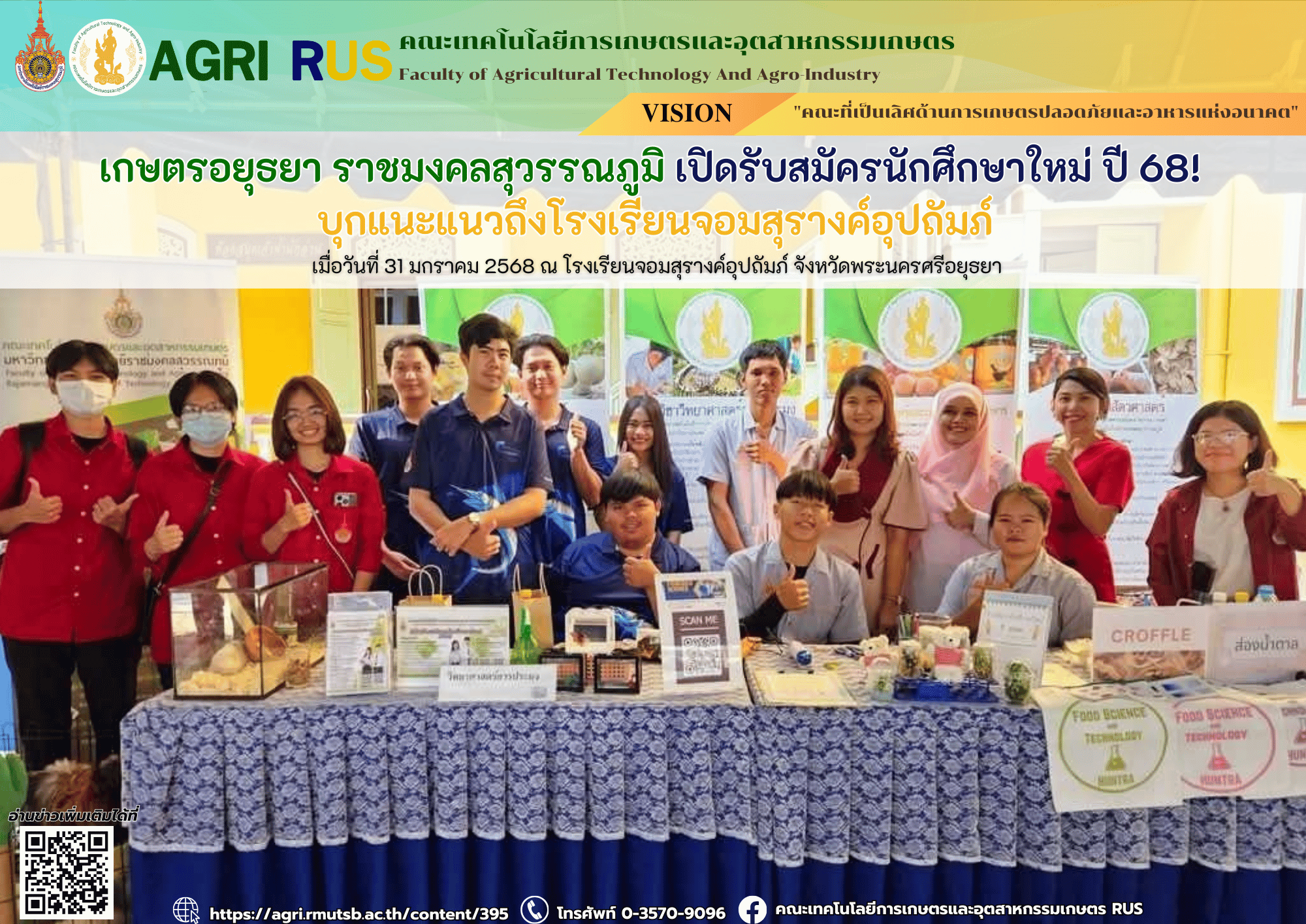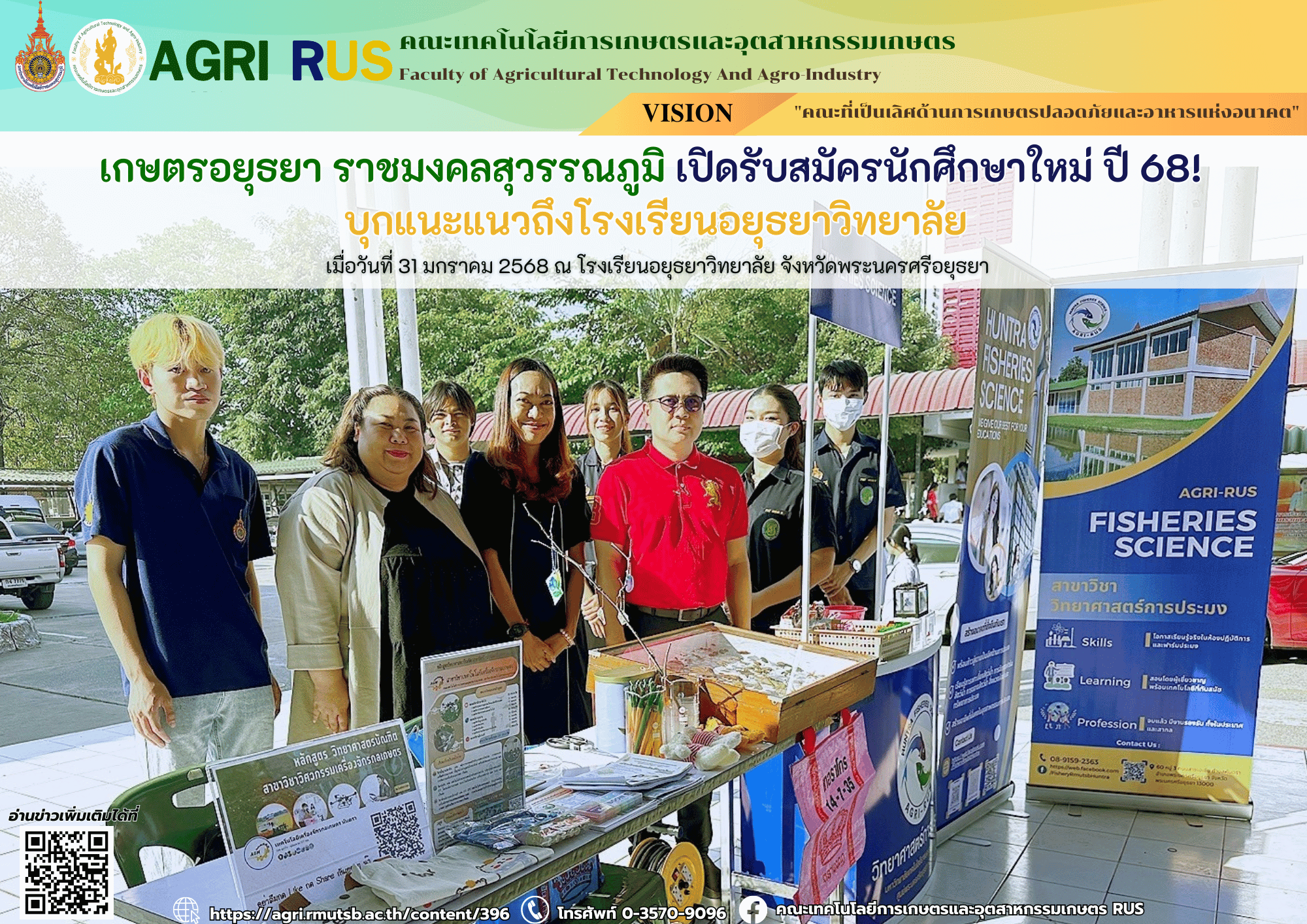 เกษตรอยุธยา ราชมงคลสุวรรณภูมิ เปิดรับสมัครนักศึกษาใหม่ ปี 68! สู่รั้วเกษตรฯ บุกแนะแนวถึงโรงเรียนบางปะอิน | 249 ครั้ง เมื่อ 9 เดือนที่แล้ว