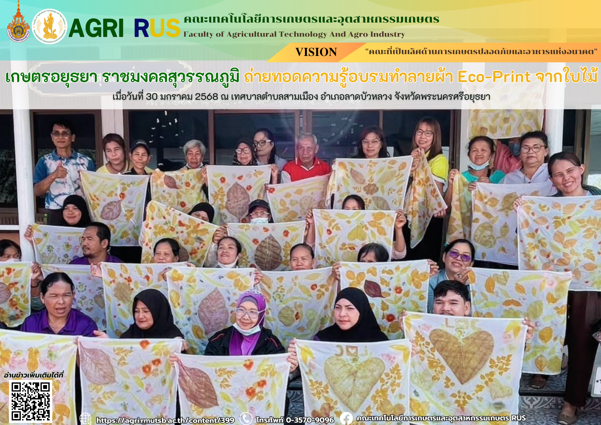 เกษตรอยุธยา ราชมงคลสุวรรณภูมิ ถ่ายทอดความรู้อบรมทำลายผ้า ECO-PRINT จากใบไม้ | 172 ครั้ง เมื่อ 10 เดือนที่แล้ว