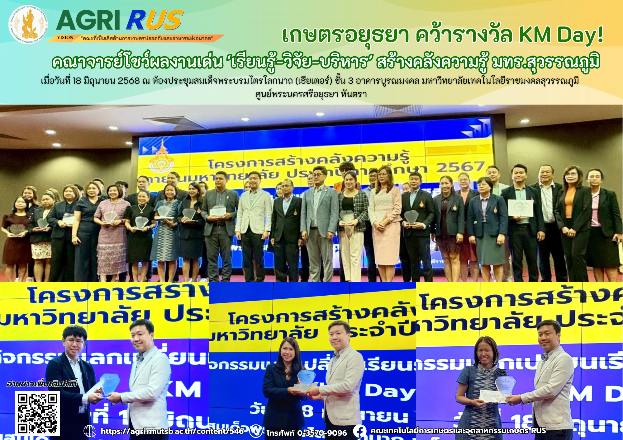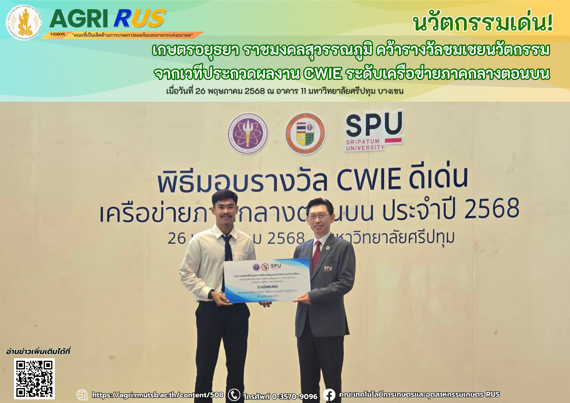 นวัตกรรมเด่น! เกษตรอยุธยา ราชมงคลสุวรรณภูมิ คว้ารางวัลชมเชยนวัตกรรม จากเวทีประกวดผลงาน CWIE ระดับเครือข่ายภาคกลางตอนบน | 189 ครั้ง เมื่อ 6 เดือนที่แล้ว
