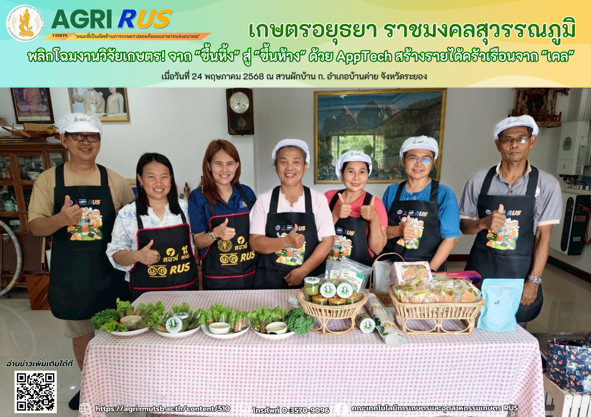 เกษตรอยุธยา ราชมงคลสุวรรณภูมิ พลิกโฉมงานวิจัยเกษตร! จาก "ขึ้นหิ้ง" สู่ "ขึ้นห้าง" ด้วย AppTech สร้างรายได้ครัวเรือนจาก "เคล" | 187 ครั้ง เมื่อ 6 เดือนที่แล้ว