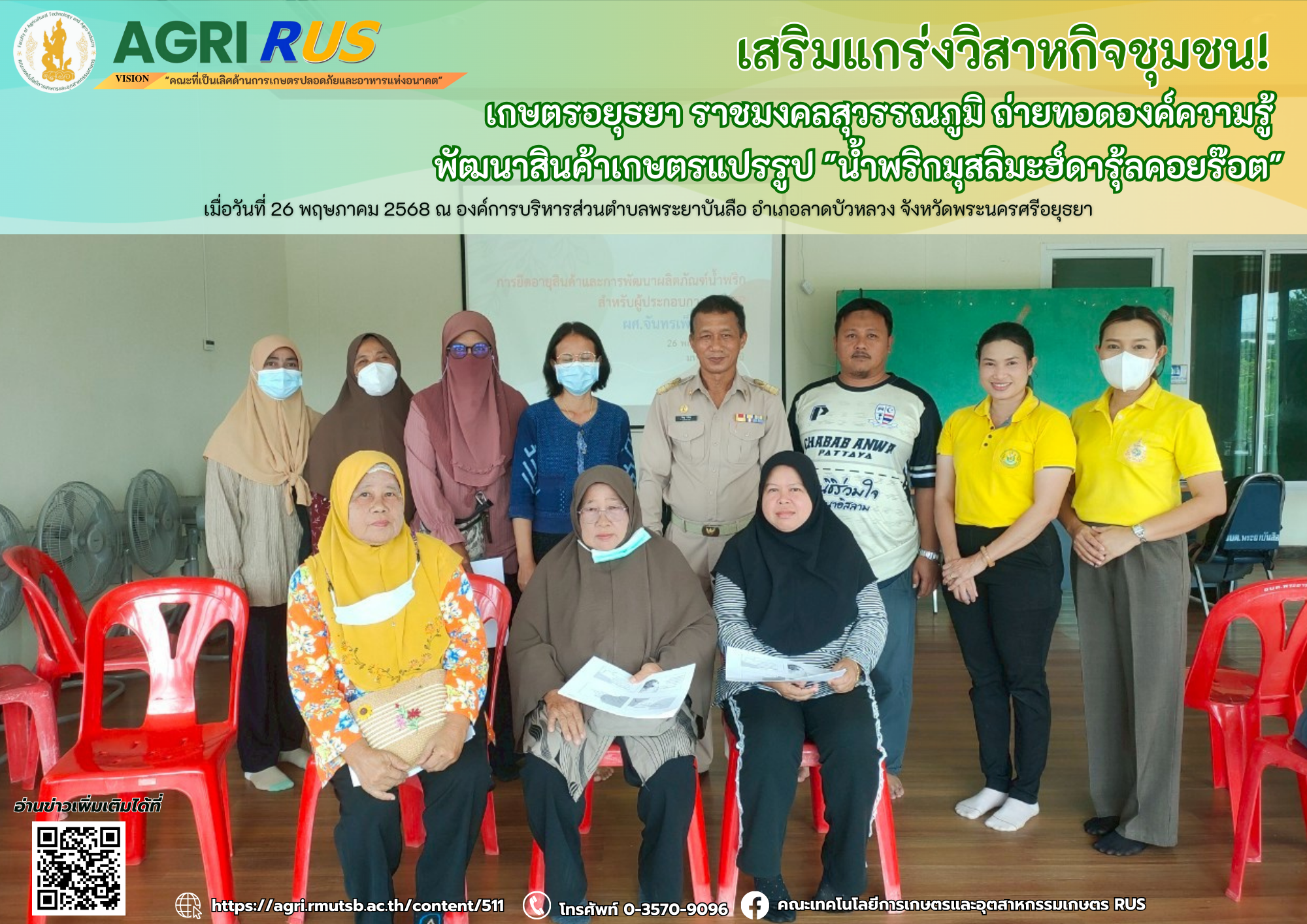 เสริมแกร่งวิสาหกิจชุมชน! เกษตรอยุธยา ราชมงคลสุวรรณภูมิ ถ่ายทอดองค์ความรู้ พัฒนาสินค้าเกษตรแปรรูป "น้ำพริกมุสลิมะฮ์ดารุ้ลคอยร๊อต" | 185 ครั้ง เมื่อ 6 เดือนที่แล้ว