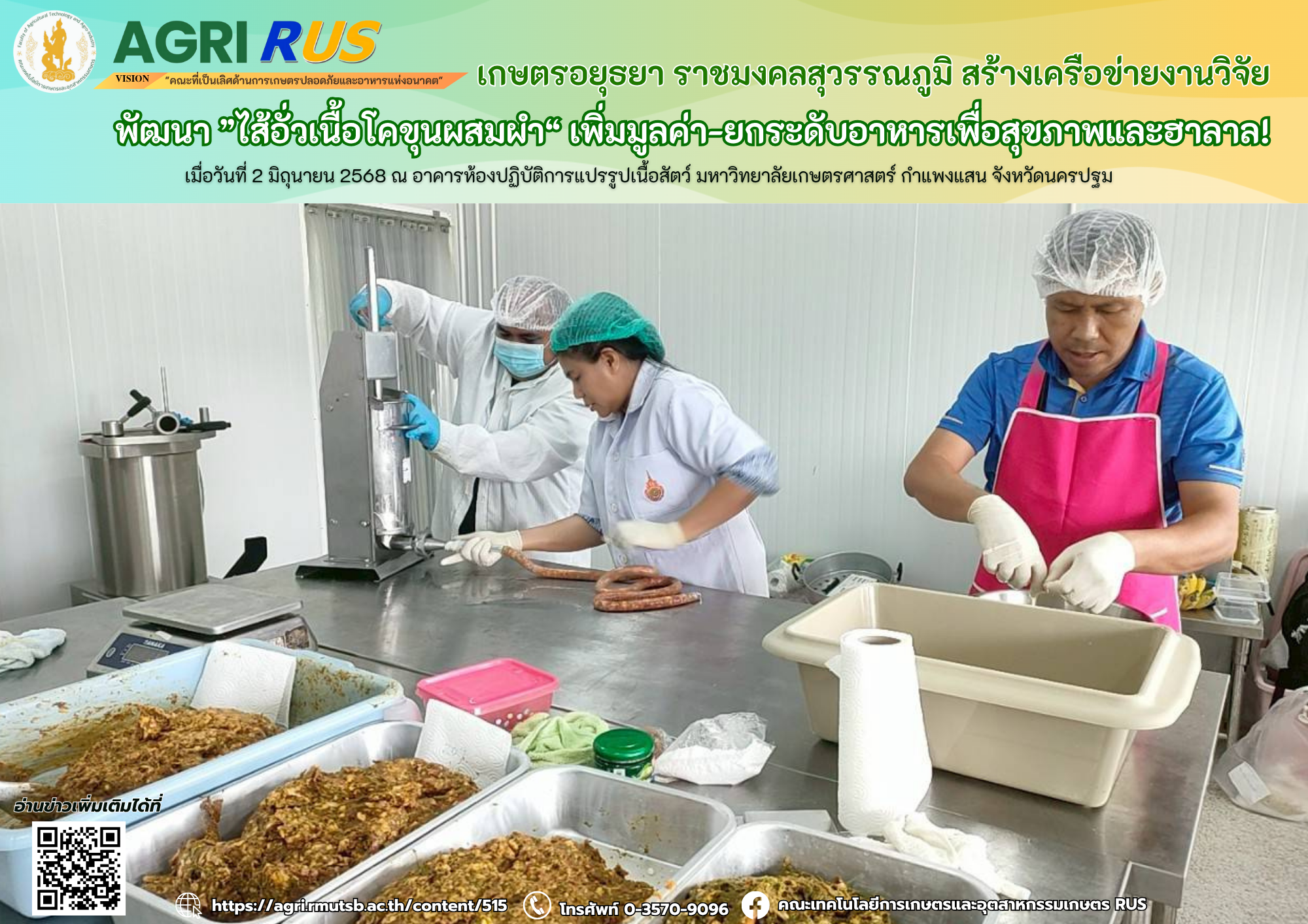 เกษตรอยุธยา ราชมงคลสุวรรณภูมิ สร้างเครือข่ายงานวิจัย พัฒนา ”ไส้อั่วเนื้อโคขุนผสมผำ“ เพิ่มมูลค่า-ยกระดับอาหารเพื่อสุขภาพและฮาลาล! | 260 ครั้ง เมื่อ 6 เดือนที่แล้ว
