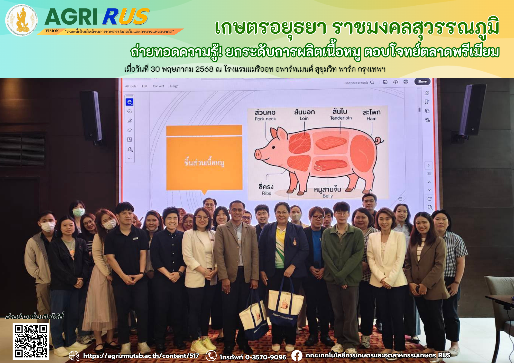 เกษตรอยุธยา ราชมงคลสุวรรณภูมิ ถ่ายทอดความรู้! ยกระดับการผลิตเนื้อหมู ตอบโจทย์ตลาดพรีเมียม | 258 ครั้ง เมื่อ 6 เดือนที่แล้ว