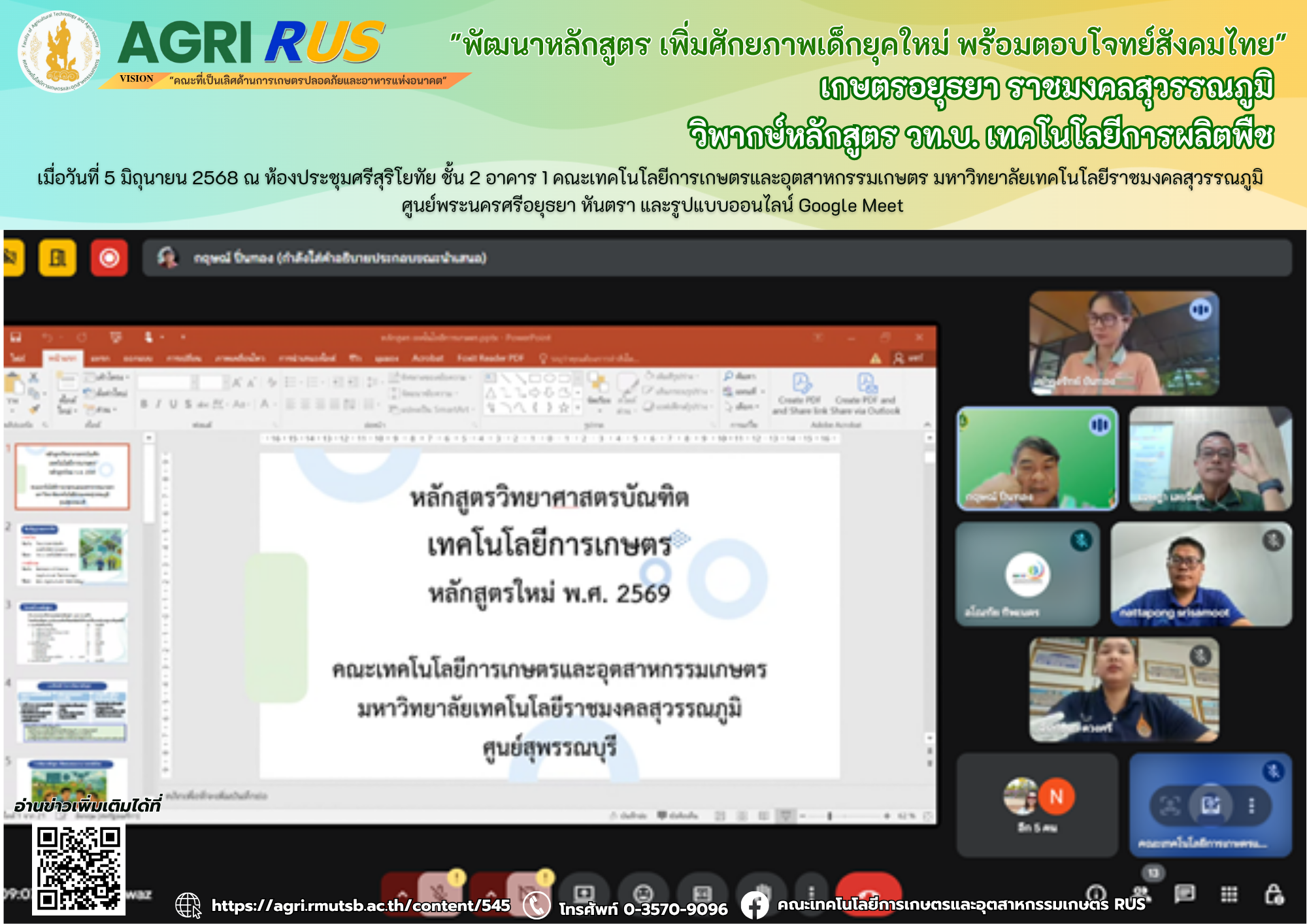“พัฒนาหลักสูตร เพิ่มศักยภาพเด็กยุคใหม่ พร้อมตอบโจทย์สังคมไทย” เกษตรอยุธยา ราชมงคลสุวรรณภูมิ วิพากษ์หลักสูตร วท.บ. เทคโนโลยีการเกษตร (หลักสูตรใหม่ พ.ศ. 2569) | 124 ครั้ง เมื่อ 5 เดือนที่แล้ว