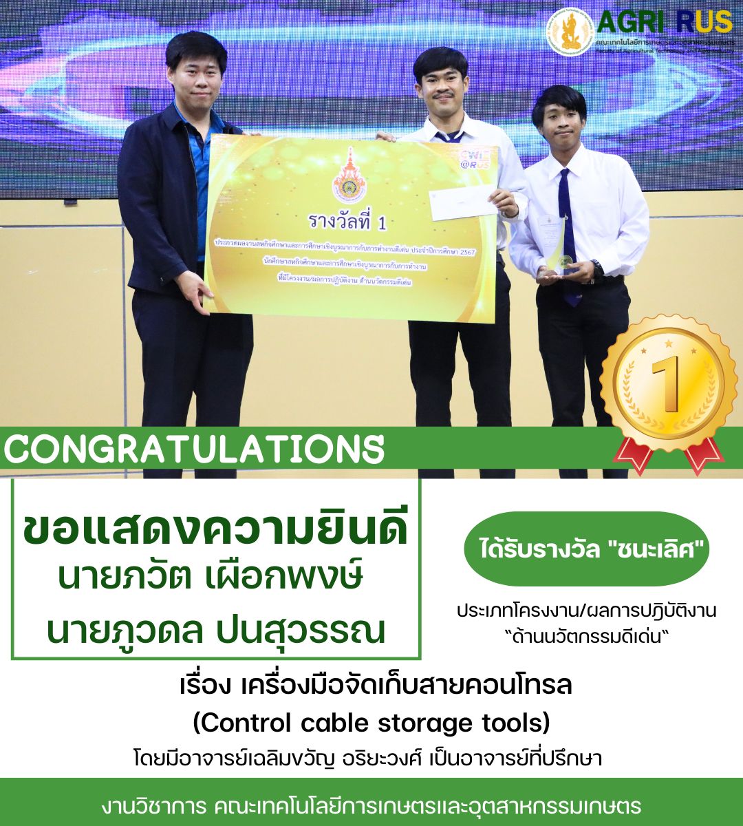 ขอแสดงความยินดีกับ นายภวัต เผือกพงษ์ และนายภูวดล ปนสุวรรณ ที่ได้รับรางวัล "ชนะเลิศ" ในการประกวดสหกิจศึกษาและการศึกษาเชิงบูรณาการกับการทำงาน “ด้านนวัตกรรมดีเด่น“