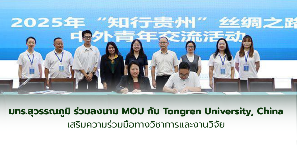 เมื่อวันอังคารที่ 19 สิงหาคม 2568 มหาวิทยาลัยเทคโนโลยีราชมงคลสุวรรณภูมิ (มทร.สุวรรณภูมิ) ได้ลงนามบันทึกความเข้าใจว่าด้วยความร่วมมือทางวิชาการ (MOU) กับ Tongren University สาธารณรัฐประชาชนจีน เพื่อยกระดับความสัมพันธ์ทางวิชาการและงานวิจัยระหว่างสองสถาบัน โดยพิธีลงนามจัดขึ้น ณ สำนักงานบริหาร Tongren University สาธารณรัฐประชาชนจีน