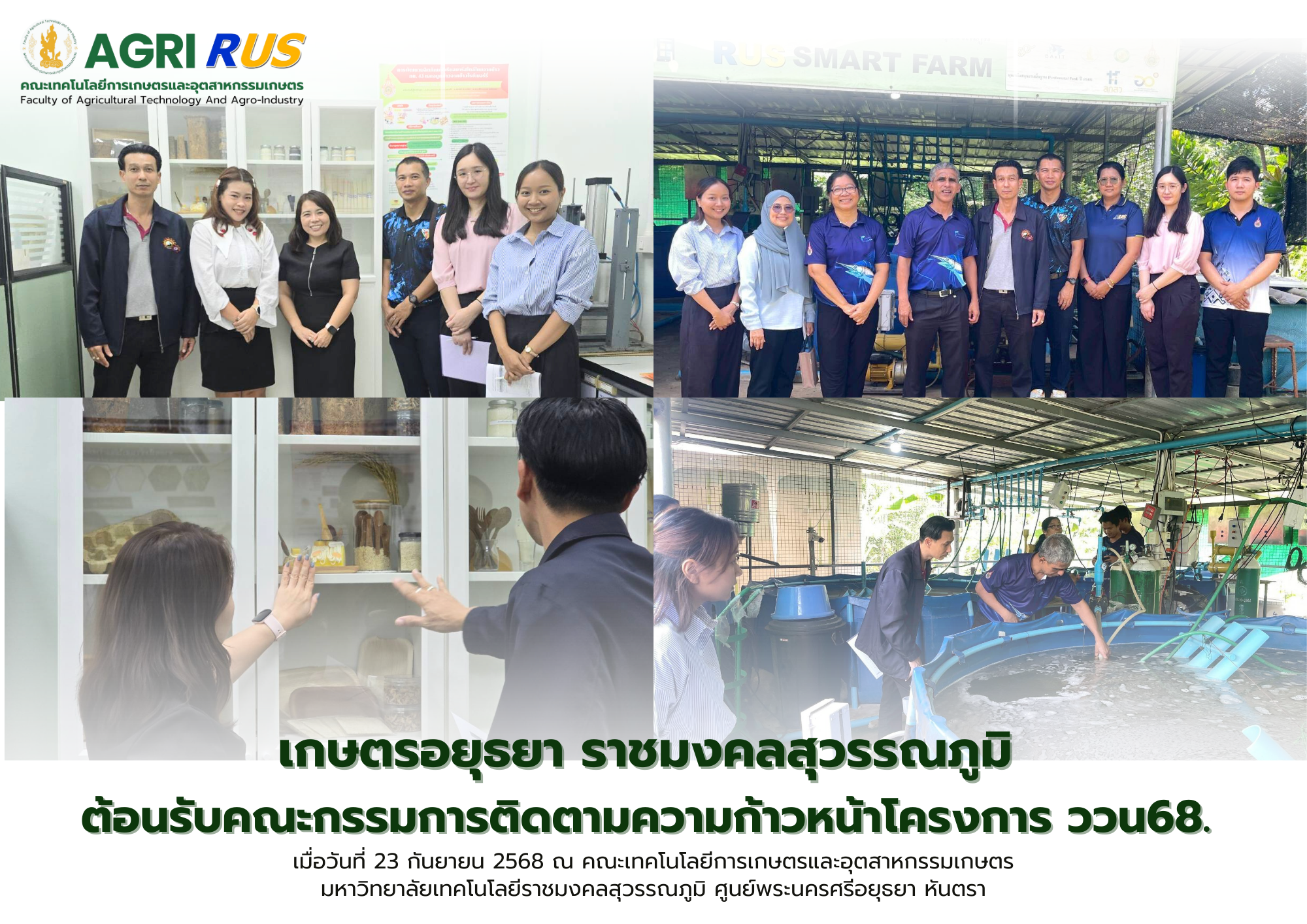 เมื่อวันที่ 23 กันยายน 2568 คณะเทคโนโลยีการเกษตรและอุตสาหกรรมเกษตร มหาวิทยาลัยเทคโนโลยีราชมงคลสุวรรณภูมิ นำโดย รองศาสตราจารย์ ดร.เจษฏา อิสเหาะ อาจารย์สาขาวิชาวิทยาศาสตร์การประมง และ ผู้ช่วยศาสตราจารย์ ดร.ฌนกร หยกสหชาติ อาจารย์สาขาวิชาวิทยาศาสตร์และเทคโนโลยีการอาหาร นักวิจัยของคณะฯ ซึ่งได้รับจัดสรรทุนวิจัยจากสำนักงานคณะกรรมการส่งเสริมวิทยาศาสตร์ วิจัยและนวัตกรรม (สกสว.) ประจำปีงบประมาณ พ.ศ. 2568 ได้ให้การต้อนรับคณะกรรมการจากสถาบันวิจัยและพัฒนา ในการลงติดตามความก้าวหน้าของโครงการวิจัย ที่ได้รับทุนสนับสนุนจาก สกสว. เพื่อให้คำแนะนำและประเมินผลการดำเนินงาน เพื่อให้มั่นใจว่าโครงการวิจัยจะสามารถดำเนินไปตามแผนงานที่กำหนดไว้และบรรลุผลลัพธ์ที่มีประสิทธิภาพ ซึ่งจะเป็นประโยชน์ในการพัฒนาองค์ความรู้และนวัตกรรมด้านการเกษตรของประเทศ ณ คณะเทคโนโลยีการเกษตรและอุตสาหกรรมเกษตร มหาวิทยาลัยเทคโนโลยีราชมงคลสุวรรณภูมิ ศูนย์พระนครศรีอยุธยา หันตรา