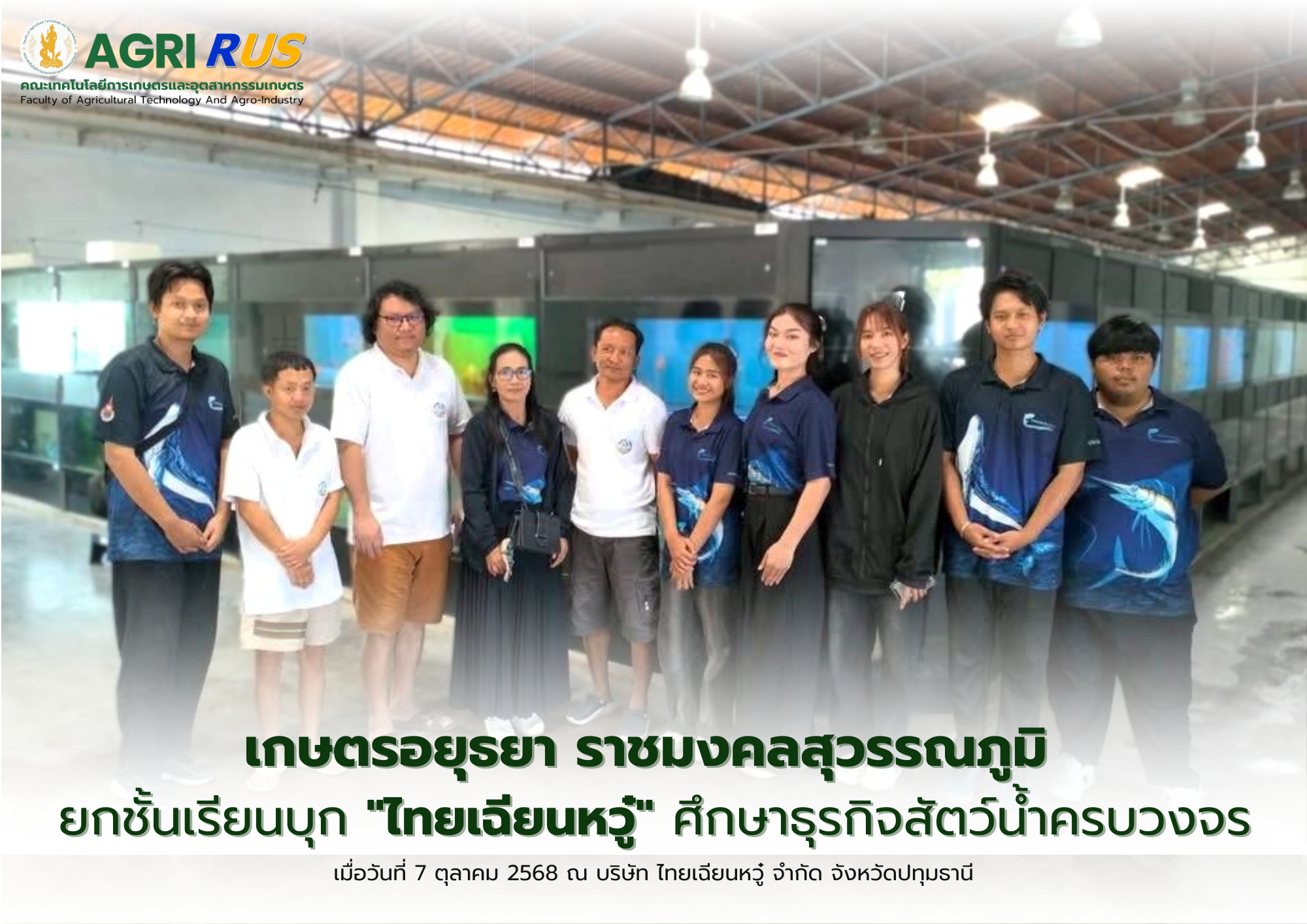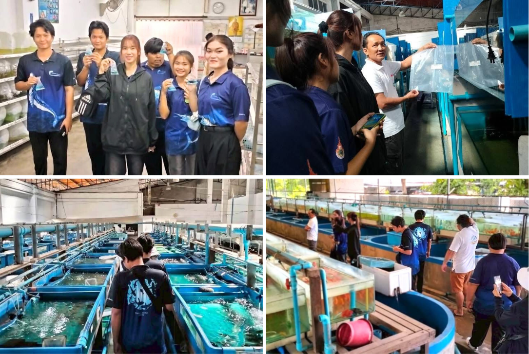 เมื่อวันที่ 7 ตุลาคม 2568 สาขาวิชาวิทยาศาสตร์การประมง คณะเทคโนโลยีการเกษตรและอุตสาหกรรมเกษตร นำโดย ผู้ช่วยศาสตราจารย์ ดร.ผกามาศ ศรีจริยา อาจารย์สาขาวิชาวิทยาศาสตร์การประมง ได้นำนักศึกษาสาขาวิชาวิทยาศาสตร์การประมงเข้าศึกษาดูงานที่ บริษัท ไทยเฉียนหวู๋ จำกัด จังหวัดปทุมธานี เพื่อให้นักศึกษาได้รับประสบการณ์ตรงและเรียนรู้เกี่ยวกับ เทคโนโลยีและนวัตกรรม ในธุรกิจสัตว์น้ำและการประมงสมัยใหม่ นักศึกษาได้ชมกระบวนการทำงานจริงในด้านต่างๆ อาทิ การเพาะเลี้ยงสัตว์น้ำเชิงพาณิชย์ การจัดการฟาร์มมาตรฐาน และการแปรรูปผลผลิต เพื่อให้เกิดความเข้าใจในห่วงโซ่คุณค่า (Value Chain) ของอุตสาหกรรมการประมงอย่างครบถ้วน