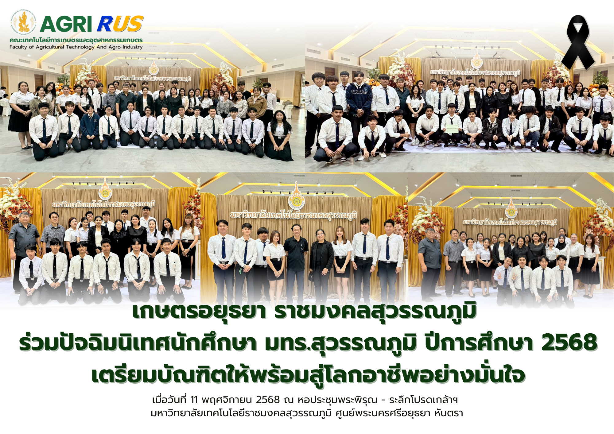 เมื่อวันอังคารที่ 11 พฤศจิกายน 2568 คณะเทคโนโลยีการเกษตรและอุตสาหกรรมเกษตร มหาวิทยาลัยเทคโนโลยีราชมงคลสุวรรณภูมิ นำโดย ผู้ช่วยศาสตราจารย์ ดร.วิจิตรา เหลียวตระกูล คณบดี พร้อมด้วยคณะผู้บริหาร คณาจารย์ เจ้าหน้าที่ และนักศึกษาระดับปริญญาตรีชั้นปีสุดท้าย เข้าร่วมโครงการปัจฉิมนิเทศนักศึกษา มหาวิทยาลัยเทคโนโลยีราชมงคลสุวรรณภูมิ ศูนย์พระนครศรีอยุธยา หันตรา ประจำปีการศึกษา 2568 โดยได้รับเกียรติจาก ผู้ช่วยศาสตราจารย์สัญญา คำจริง รองอธิการบดีมหาวิทยาลัยเทคโนโลยีราชมงคลสุวรรณภูมิ เป็นประธานในพิธี พร้อมกล่าวให้โอวาทและข้อคิดแก่นักศึกษาที่กำลังจะสำเร็จการศึกษา เพื่อเตรียมความพร้อมก้าวสู่การทำงานและการใช้ชีวิตในสังคมอย่างมีคุณค่า ณ หอประชุมพระพิรุณ-ระลึกโปรดเกล้าฯ มหาวิทยาลัยเทคโนโลยีราชมงคลสุวรรณภูมิ ศูนย์พระนครศรีอยุธยา หันตรา