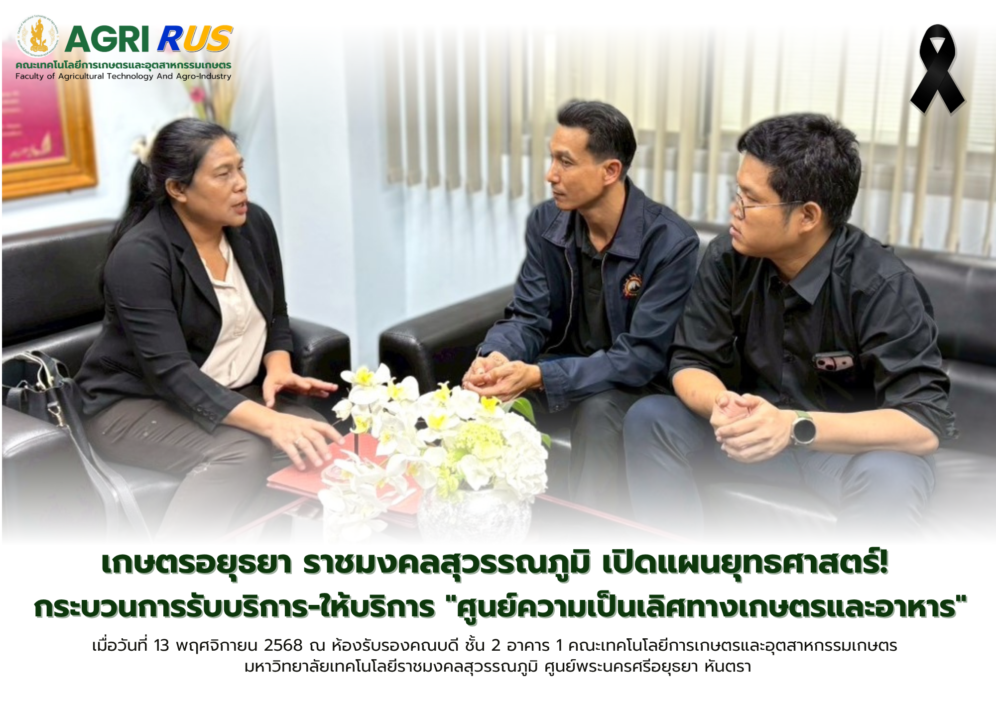 เมื่อวันพุธที่ 13 พฤศจิกายน 2568 ผู้ช่วยศาสตราจารย์พาขวัญ ทองรักษ์ รองคณบดีด้านพัฒนานักศึกษา ได้นำเสนอข้อมูลกระบวนการรับบริการและให้บริการของ “ศูนย์ความเป็นเลิศทางเกษตรและอาหาร” ต่อคณะผู้บริหารสถาบันวิจัยและพัฒนา นำโดย ผู้ช่วยศาสตราจารย์ ดร.สุวัฒน์ สกุลชาติ รองผู้อำนวยการสถาบันวิจัยและพัฒนา และ อาจารย์ ดร.ศิวัตม์ พลอินทร์ รองผู้อำนวยการสถาบันวิจัยและพัฒนา เพื่อสร้างความเข้าใจที่ชัดเจนเกี่ยวกับศักยภาพและขั้นตอนการดำเนินงานของศูนย์ความเป็นเลิศฯ ซึ่งเป็นหน่วยงานสำคัญในการขับเคลื่อนงานวิจัย บริการวิชาการ และนวัตกรรมด้านการเกษตรและเทคโนโลยีอาหารของคณะฯ ณ ห้องรับรองคณบดี ชั้น 2 อาคาร 1 คณะเทคโนโลยีการเกษตรและอุตสาหกรรมเกษตร มหาวิทยาลัยเทคโนโลยีราชมงคลสุวรรณภูมิ ศูนย์หันตรา