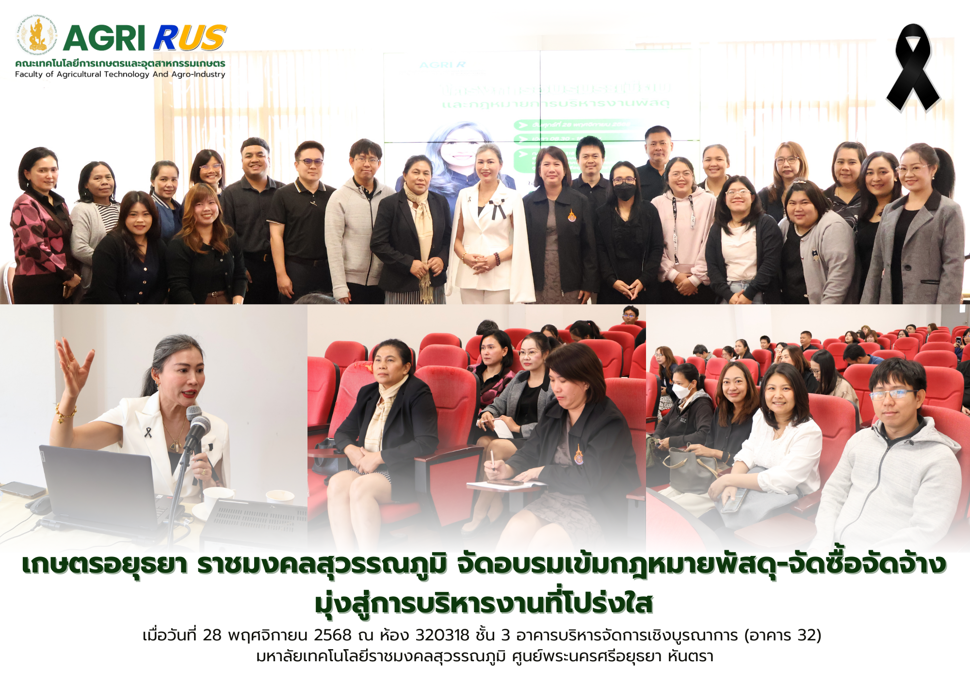 เมื่อวันที่ 28 พฤศจิกายน 2568 คณะเทคโนโลยีการเกษตรและอุตสาหกรรมเกษตร มหาวิทยาลัยเทคโนโลยีราชมงคลสุวรรณภูมิ จัดโครงการอบรมระเบียบและกฎหมายการบริหารงานพัสดุ ในหัวข้อ "ระเบียบการจัดซื้อจัดจ้าง ขั้นตอน และบทบาทหน้าที่ของคณะกรรมการในกระบวนการจัดซื้อจัดจ้าง" โดยมี ผศ.พาขวัญ ทองรักษ์ รองคณบดีด้านพัฒนานักศึกษา เป็นประธานในพิธีเปิด วัตถุประสงค์เพื่อส่งเสริมและสนับสนุนให้บุคลากรมีความรู้เกี่ยวกับระเบียบและกฎหมายการบริหารงานพัสดุอย่างลึกซึ้ง และเข้าใจบทบาทหน้าที่ของคณะกรรมการในกระบวนการจัดซื้อจัดจ้างมากขึ้น เพื่อให้สามารถนำไปสู่การ ปฏิบัติงานอย่างถูกต้องและโปร่งใส ตามหลักธรรมาภิบาล โดยได้รับเกียรติจาก ดร.ศุภดามาศ จันทาธอน มาเป็นวิทยากรบรรยายให้ความรู้ ณ ห้อง 320318 ชั้น 3 อาคารบริหารจัดการเชิงบูรณาการ (อาคาร 32) มหาลัยเทคโนโลยีราชมงคลสุวรรณภูมิ ศูนย์พระนครศรีอยุธยา หันตรา