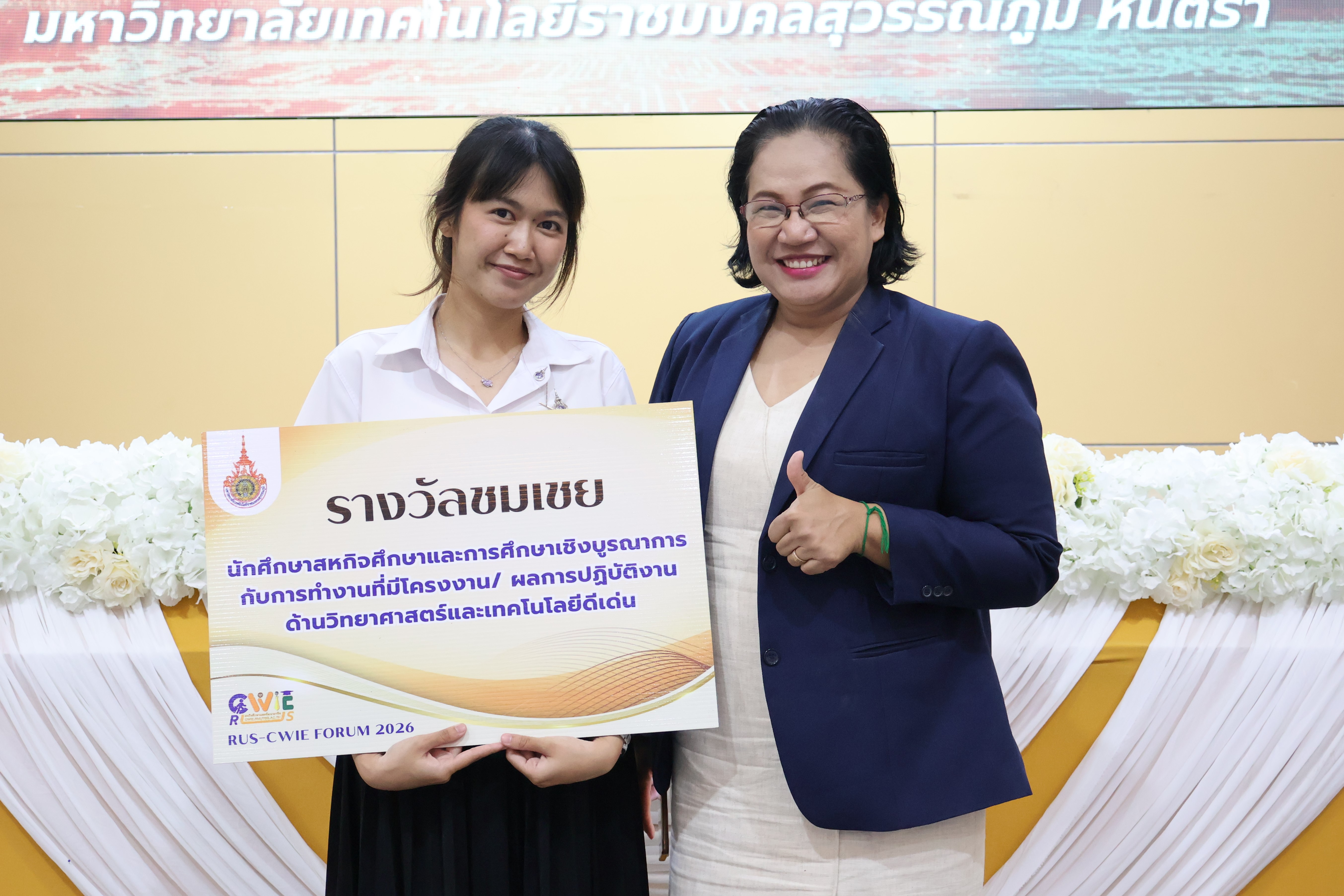 เมื่อวันที่ 25 กุมภาพันธ์ 2569 คณะเทคโนโลยีการเกษตรและอุตสาหกรรมเกษตร มหาวิทยาลัยเทคโนโลยีราชมงคลสุวรรณภูมิ นำนักศึกษาเข้าร่วมประกวดผลงานสหกิจศึกษาและการศึกษาเชิงบูรณาการกับการทำงานดีเด่น ในงาน Matching JOB & CWIE Day ณ หอประชุมพระพิรุณ-โปรดเกล้าฯ มหาวิทยาลัยเทคโนโลยีราชมงคลสุวรรณภูมิ ศูนย์พระนครศรีอยุธยา หันตรา โดยคณะเทคโนโลยีการเกษตรและอุตสาหกรรมเกษตร ได้รับรางวัลถึง 4 รางวัล ได้แก่
